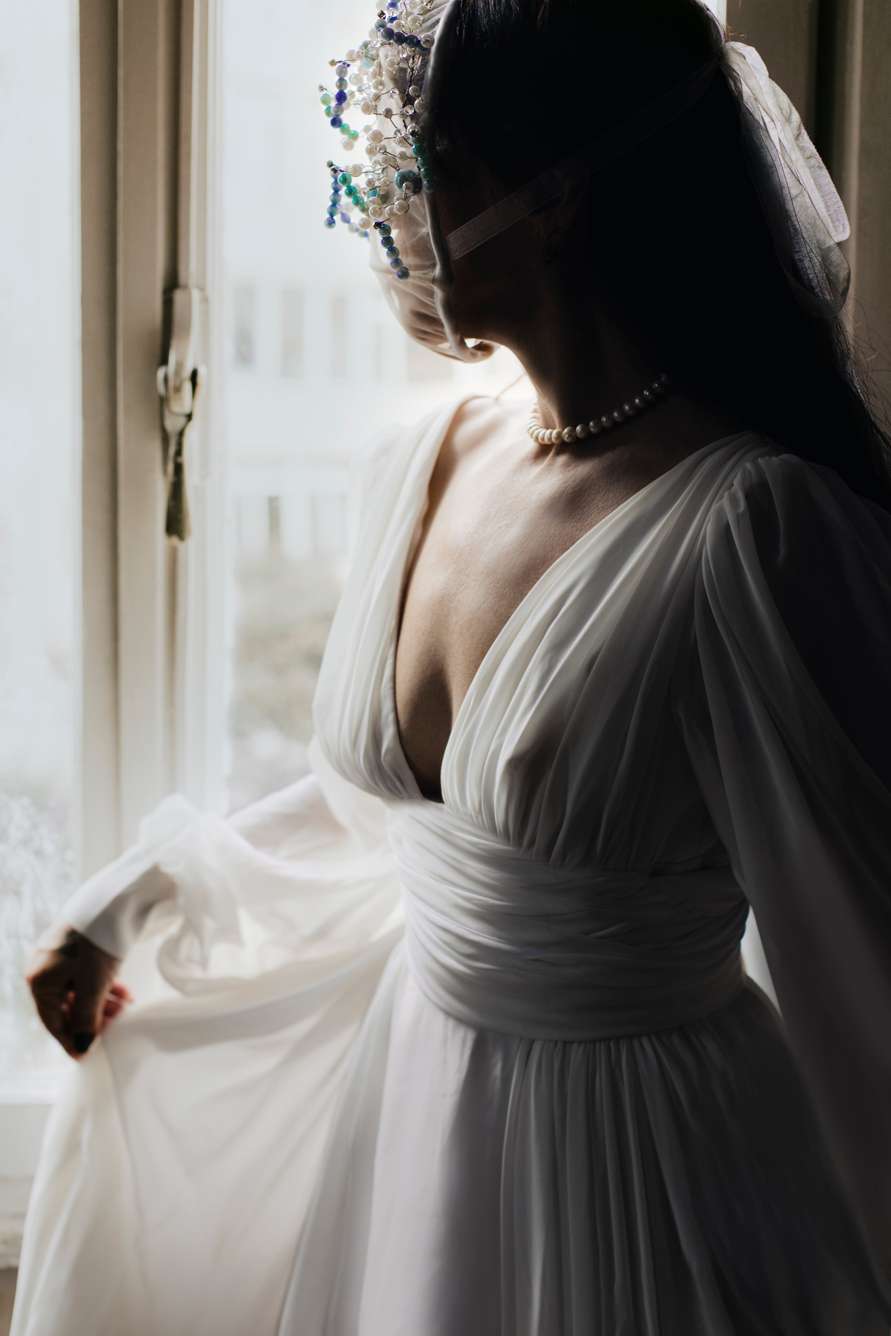 A full-coverage mesh mask draped with cascading pearl garlands in white and turquoise tones. Over 40 hand-beaded strands sway with breath and motion, creating shimmer and dimensional silhouette on stage or camera. Designed for festival performance, fashion editorials, masquerade, cosplay and collectors of sculptural mask art.
