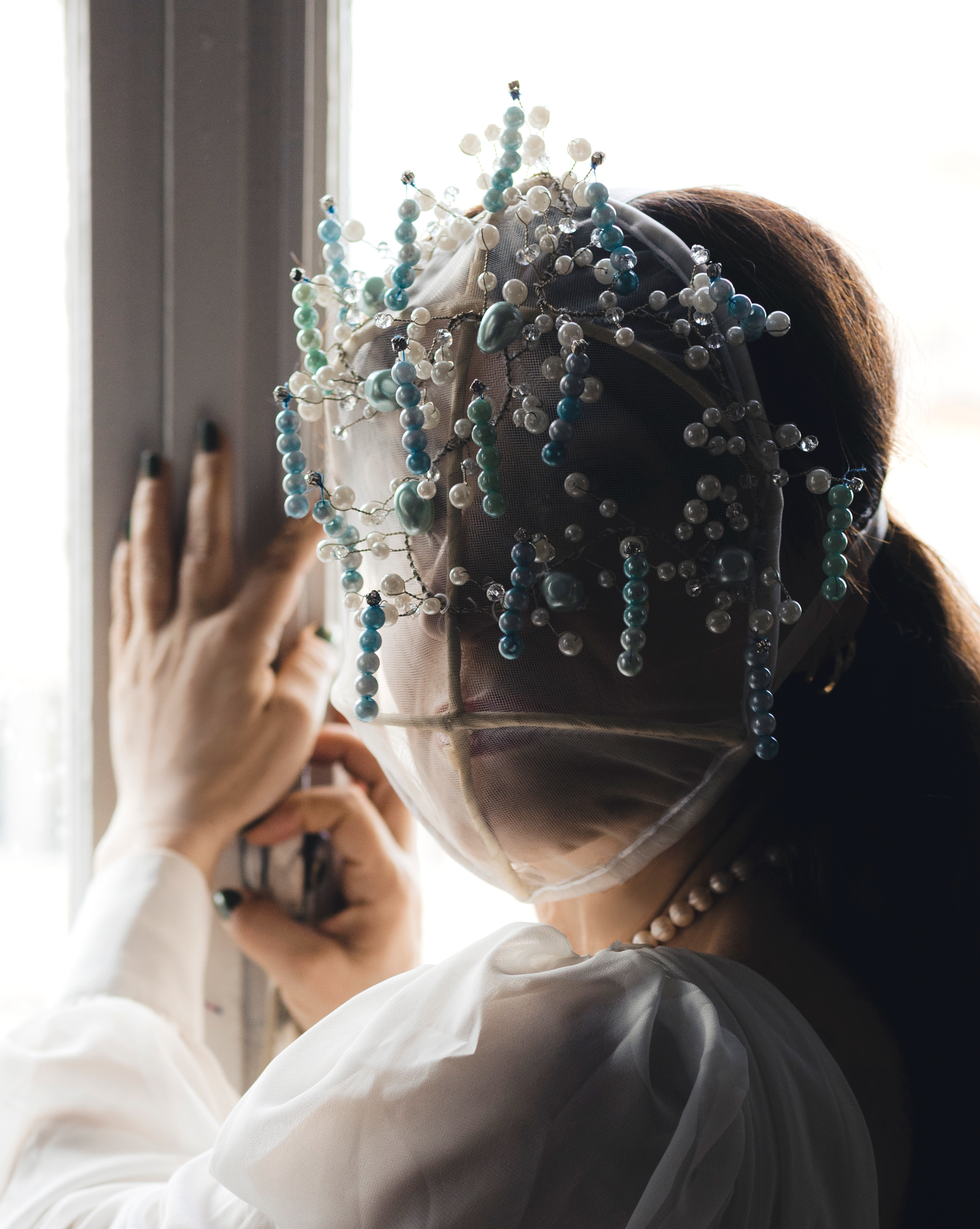 Handmade white mesh mask with blue pearl garlands. Lightweight couture veil headpiece for stage, masquerade, cosplay and festival performance.